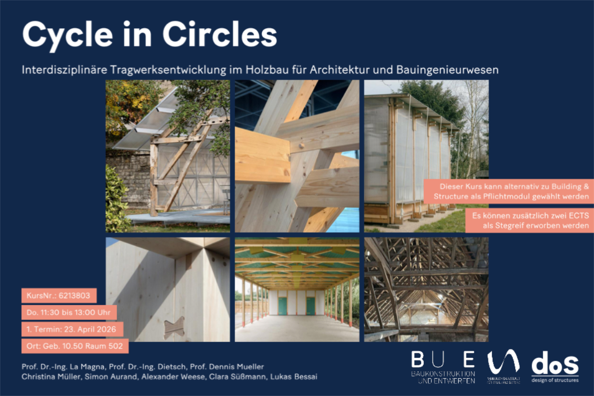 Im interdisziplinären Seminar „Cycle in Circles“ wird in Zusammenarbeit der Professuren BuE, dos und Studierenden des Bauingenieurwesens ein Pavillon für die Gartenschau Bad Urach 2027 entworfen.