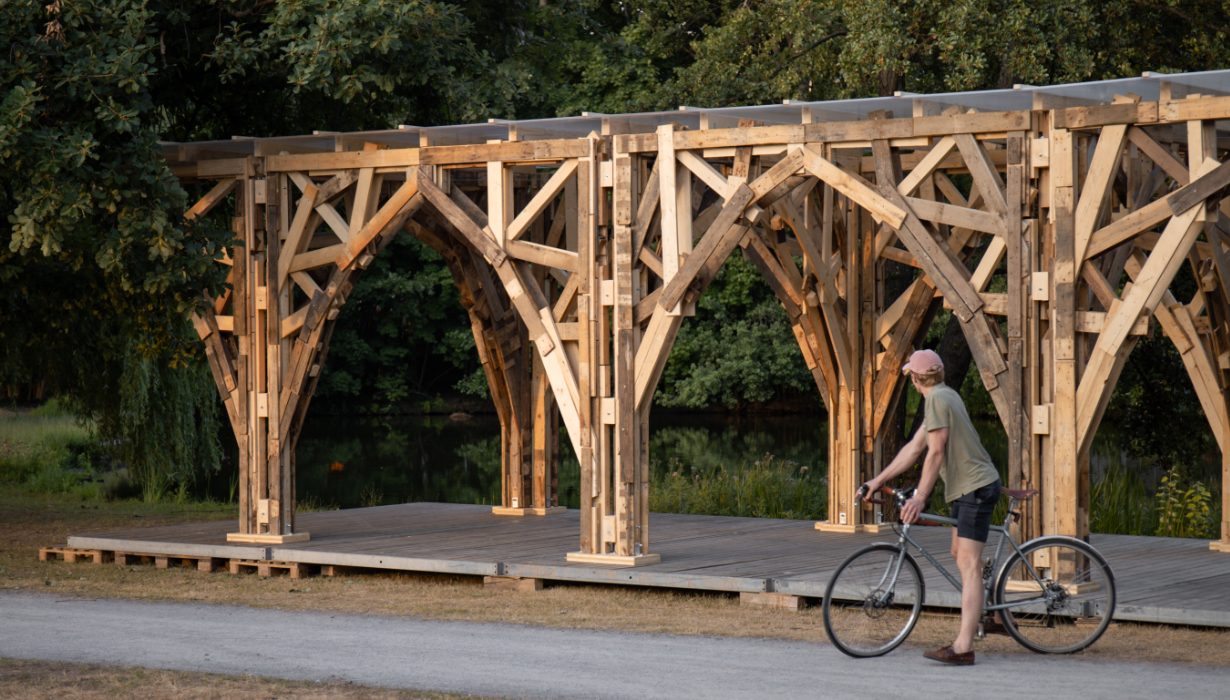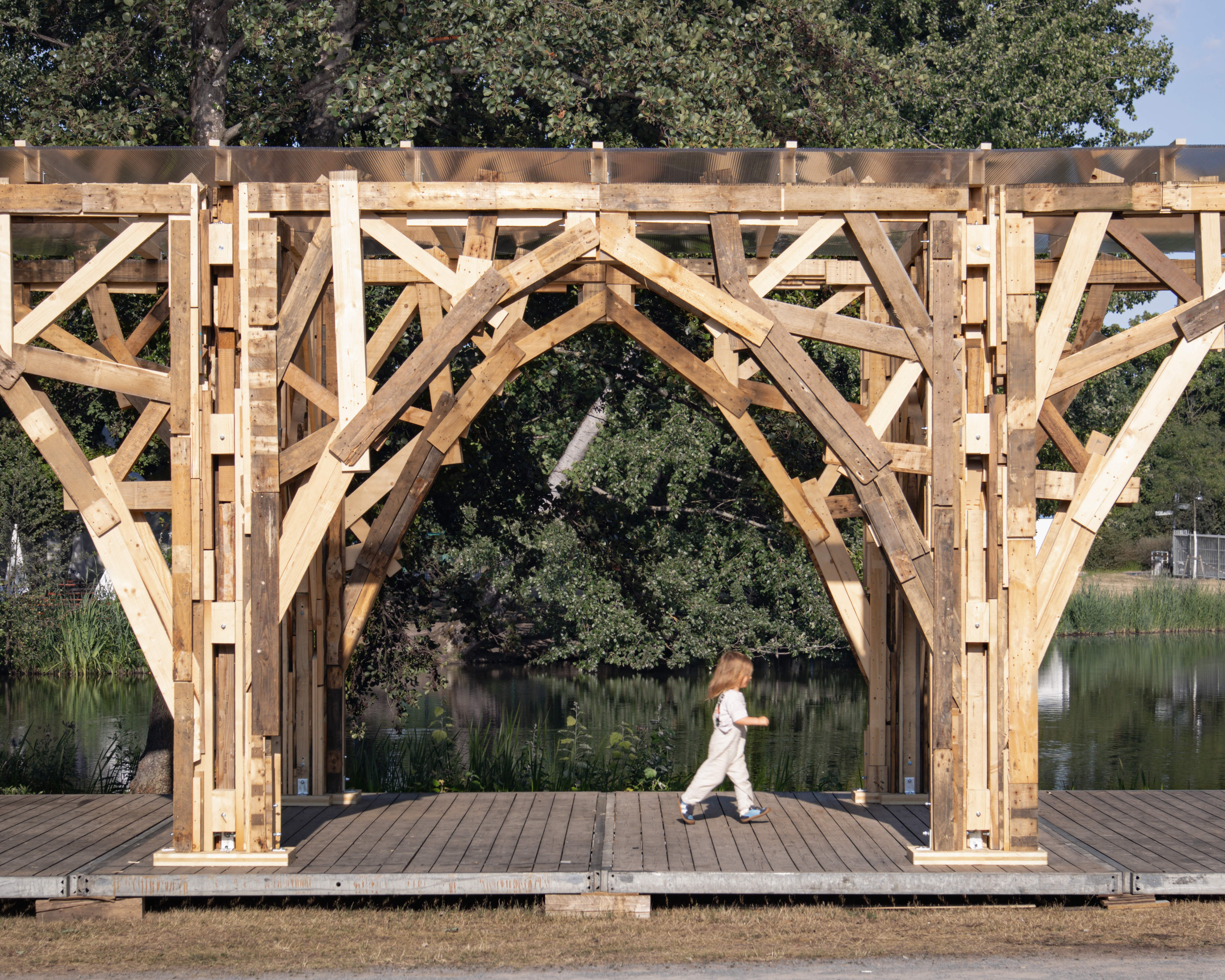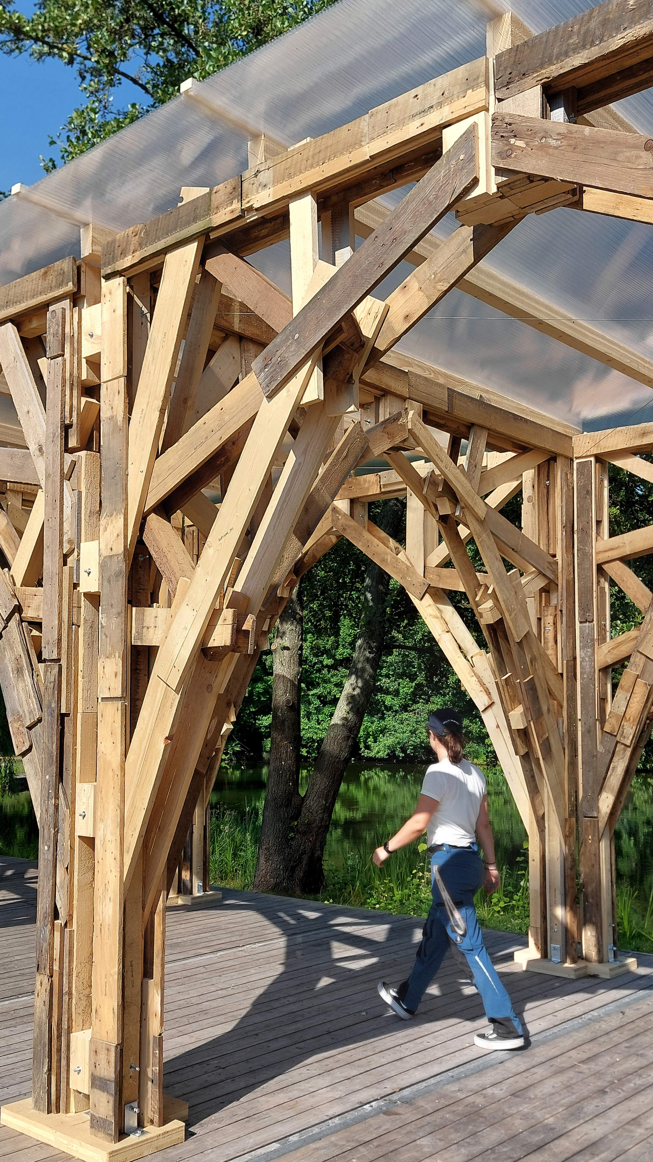 Built for the Klima Akademie at the Das Fest festival in Karlsruhe in July 2025 as a temporary podium for workshops and public events, ReFrame invites visitors to experience circular construction first-hand. By showing how waste wood can be transformed into adaptable, high-quality building components, it opens a broader conversation about more sustainable futures for architecture and construction. It is meant to be rebuilt for several years.