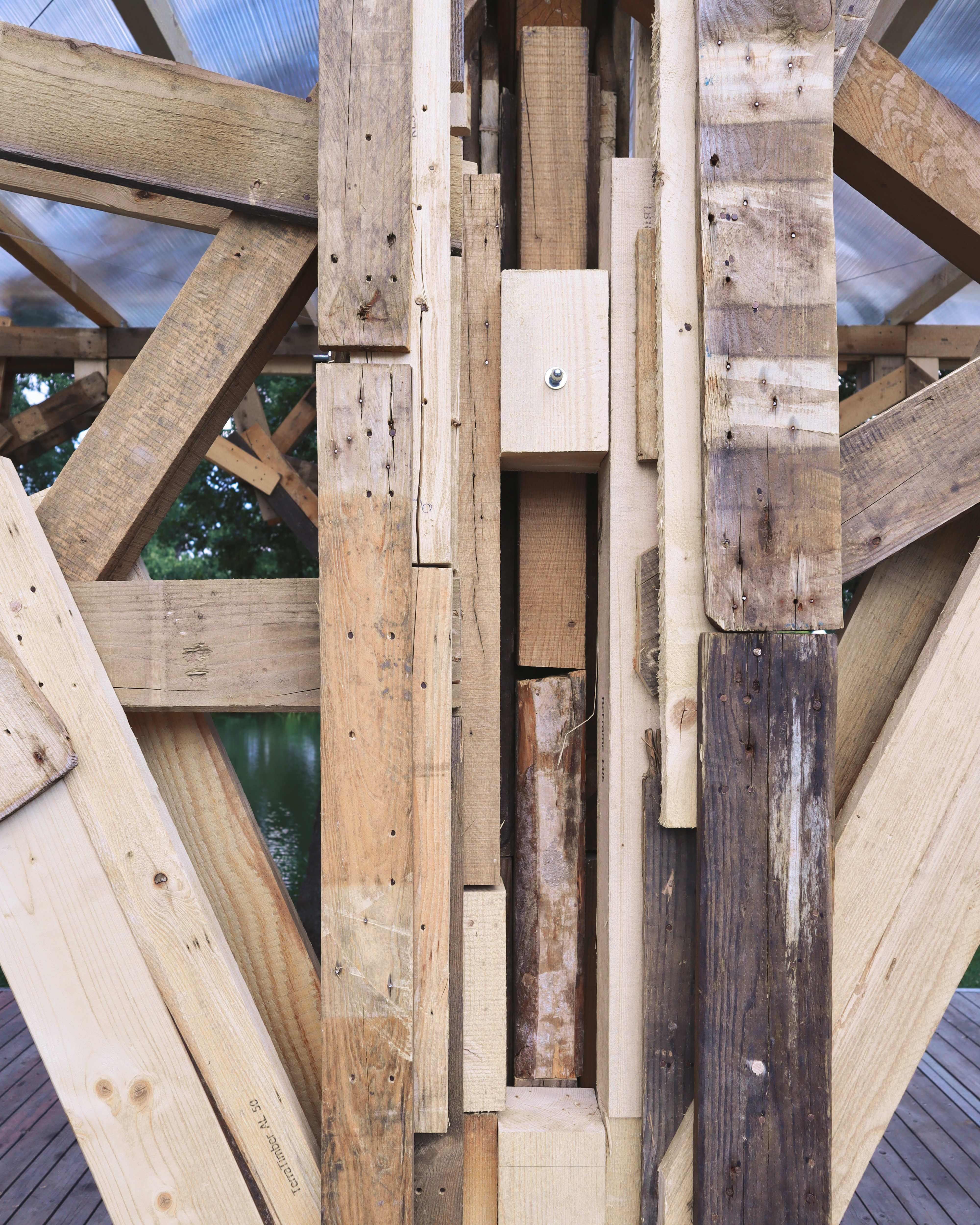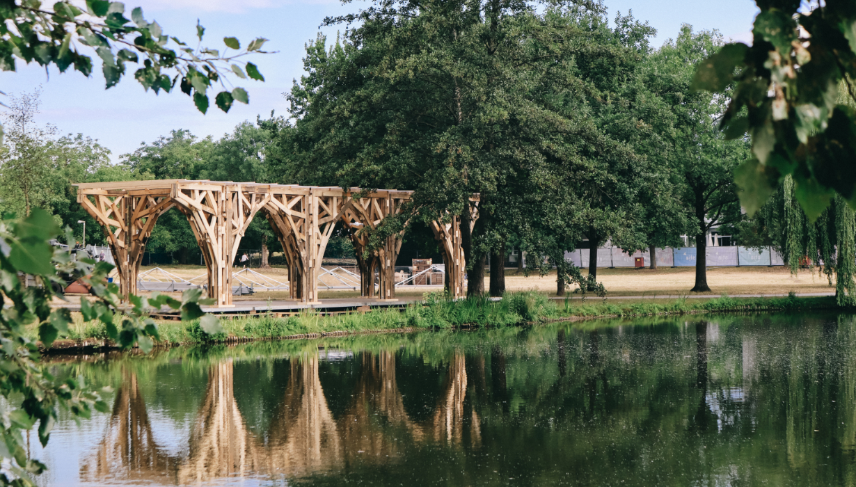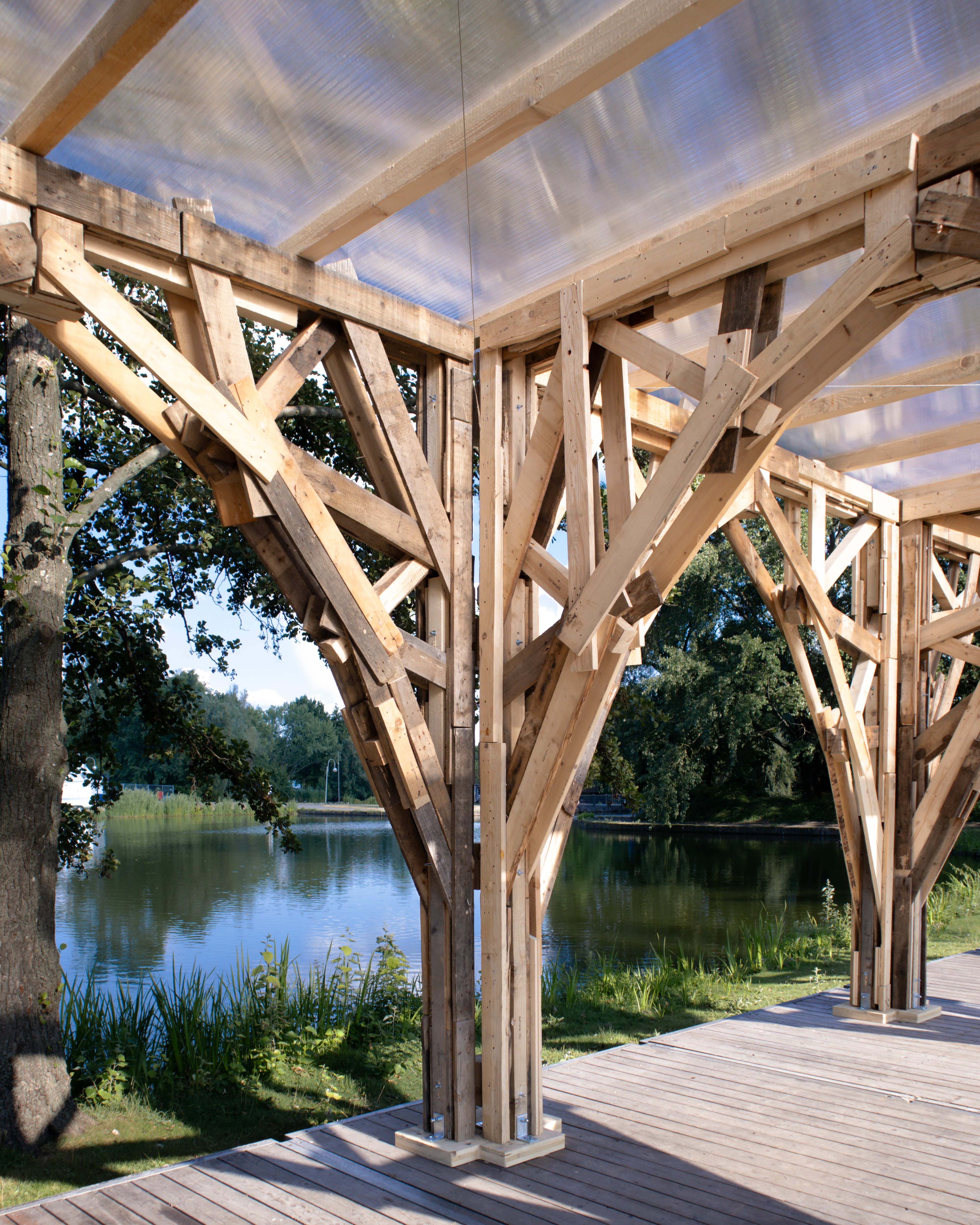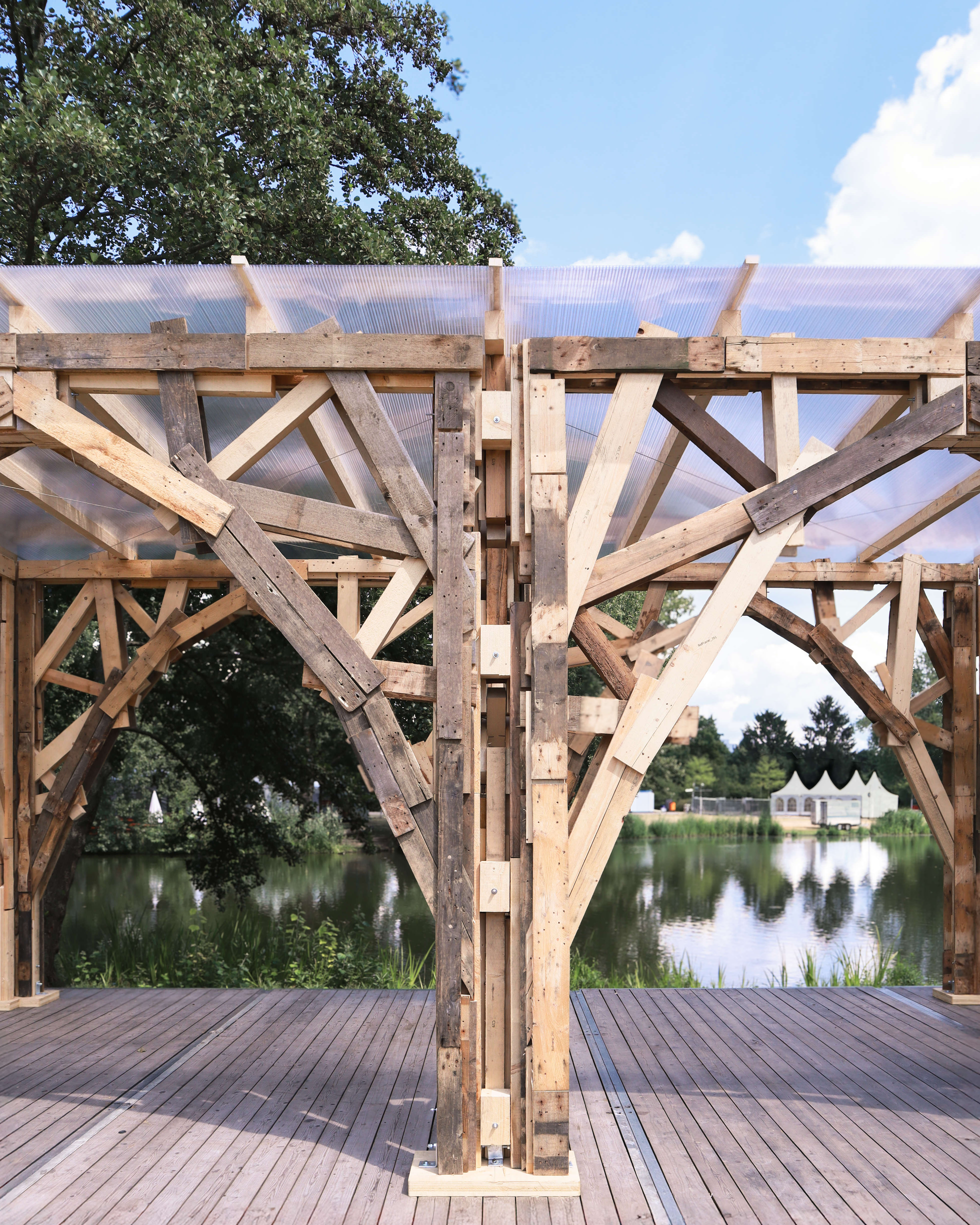 Built for the Klima Akademie at the Das Fest festival in Karlsruhe in July 2025 as a temporary podium for workshops and public events, ReFrame invites visitors to experience circular construction first-hand. By showing how waste wood can be transformed into adaptable, high-quality building components, it opens a broader conversation about more sustainable futures for architecture and construction. It is meant to be rebuilt for several years.