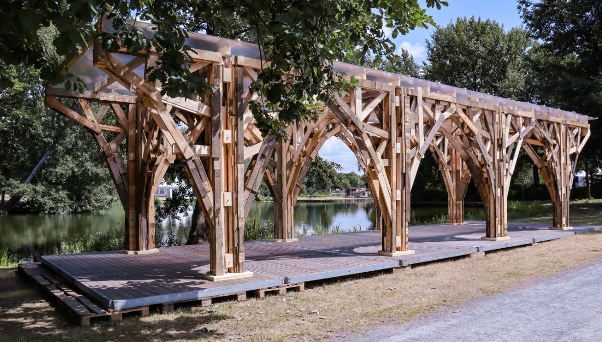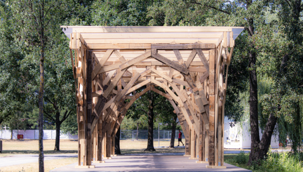 ReFrame is a modular structure that shows how reclaimed timber can be given a second life through digital design and robotic fabrication. It highlights the structural potential and distinct histories embedded in reclaimed timber, showing how it can turn reclaimed timber from a low-grade waste stream into a valuable resource for construction.