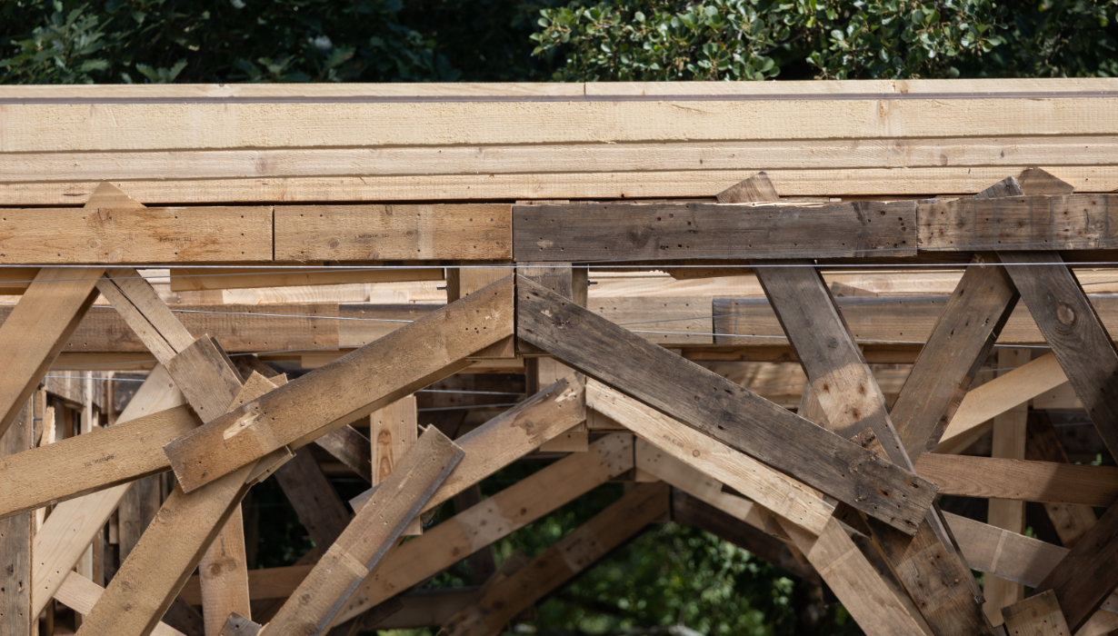 Each piece of waste wood - from industrial offcuts, pallets, or demolition - varies in dimension and quality. To capture these differences, each element is scanned and digitally mapped. A custom design script then generates multiple variations of triangulated truss topologies, where connection points can be shifted within the plane to create new configurations. These variations are evaluated against the available inventory (and supplemented with sawmill-sourced timber if no matches are possible), taking into account structural performance, fabrication requirements, and production time. In this way, the design minimizes cutting, reduces waste, and maximizes the use of reclaimed timber - resulting in assemblies that are modular in principle but uniquely shaped in detail.