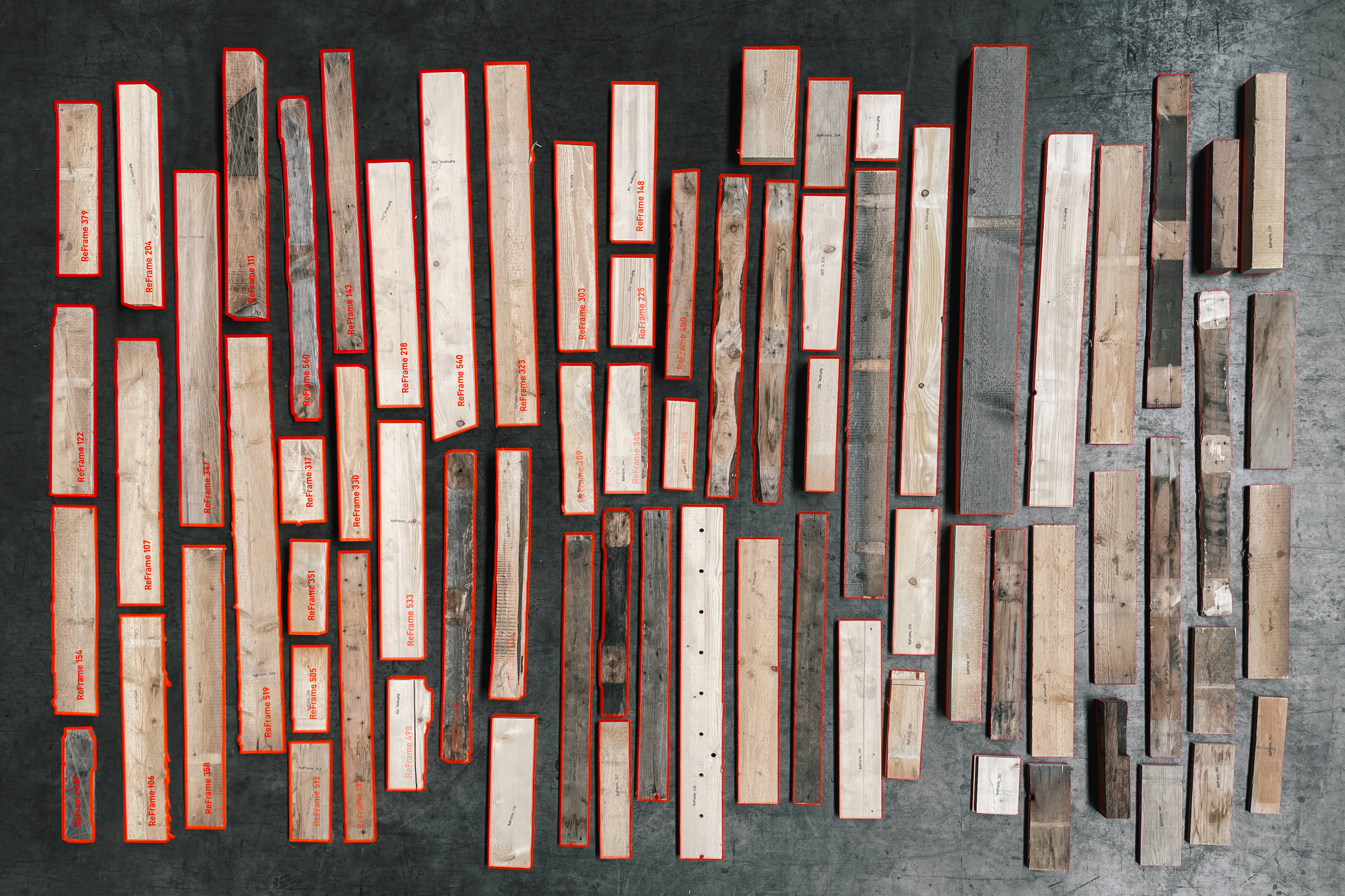 ReFrame makes the qualities of reclaimed timber visible. The assembly reveals the variety of the material and the traces of its previous use, transforming irregularities into a distinctive part of the design language.