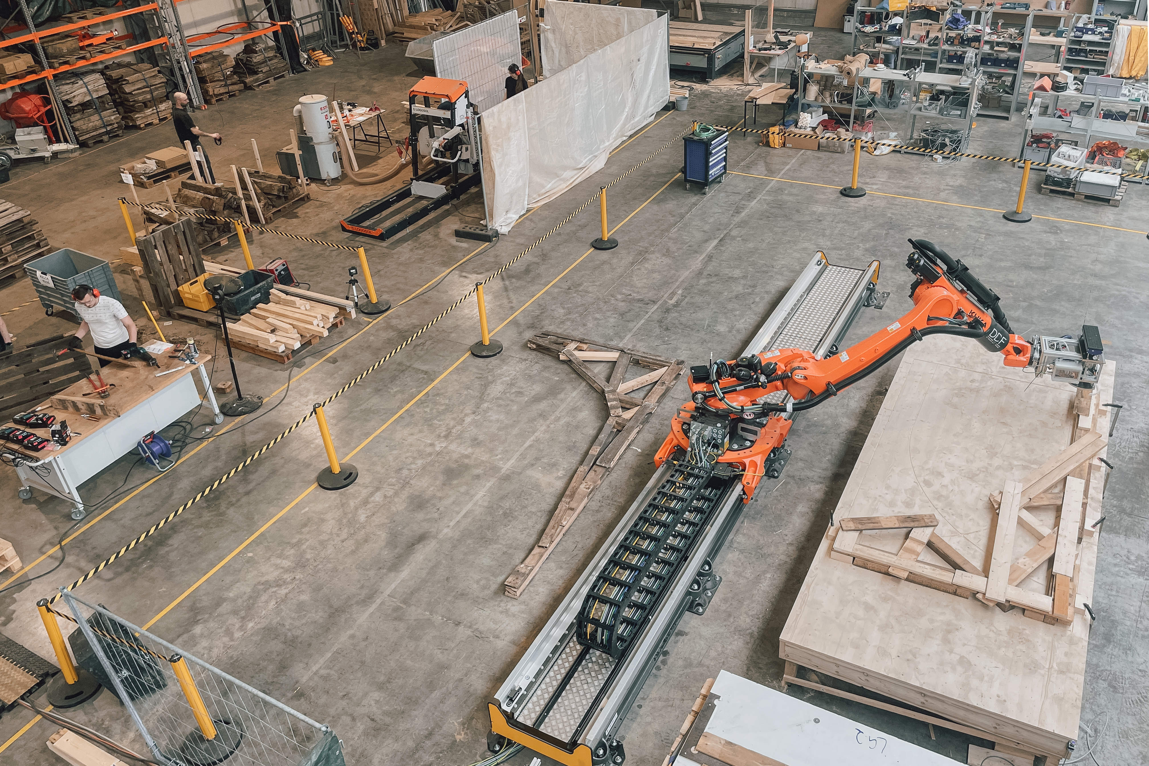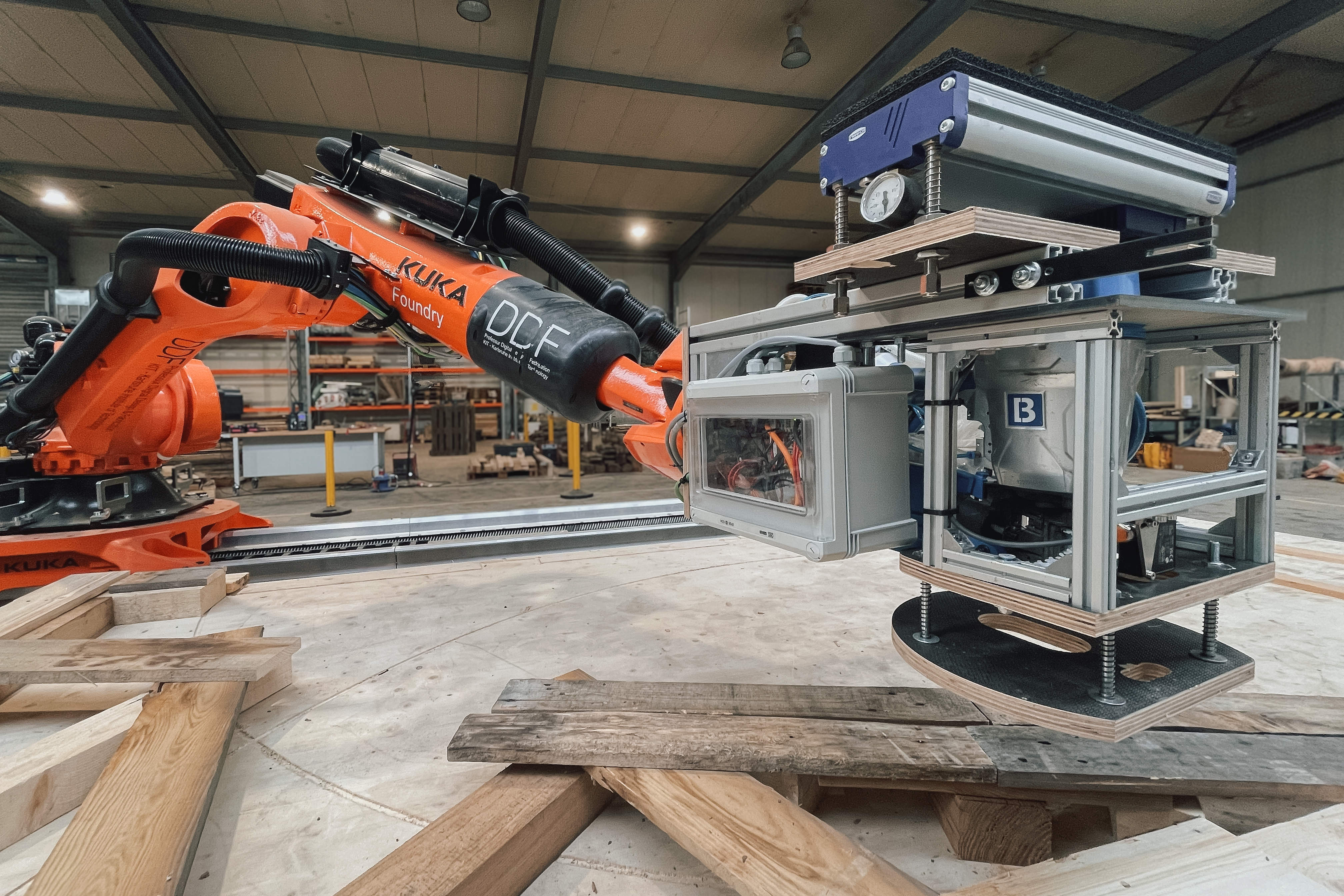 To translate this complexity into built form, the project uses an industrial robot on a linear axis to execute automated pick-and-place routines that manage irregular geometries and adjust to slight deformations not fully captured during scanning. Robotic nailing then creates precise, mono-material joints tailored to both geometry and structural requirements, demonstrating how adaptive fabrication strategies can make reclaimed timber viable for new construction.